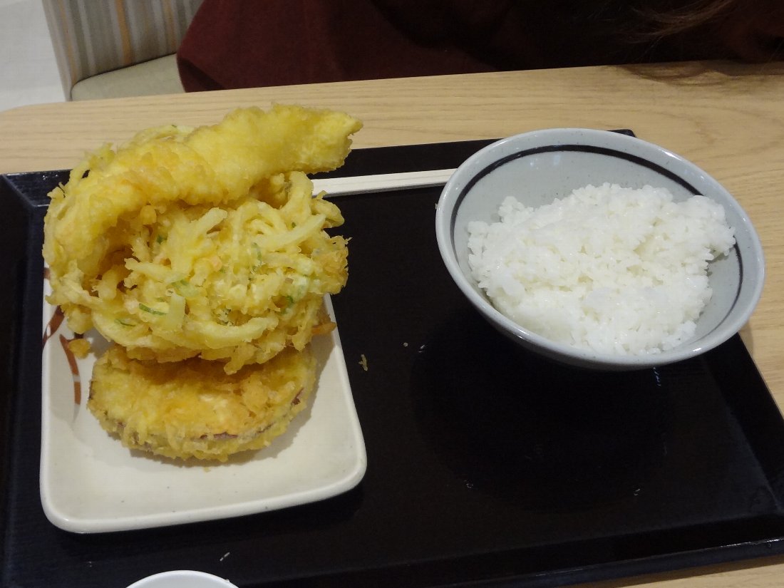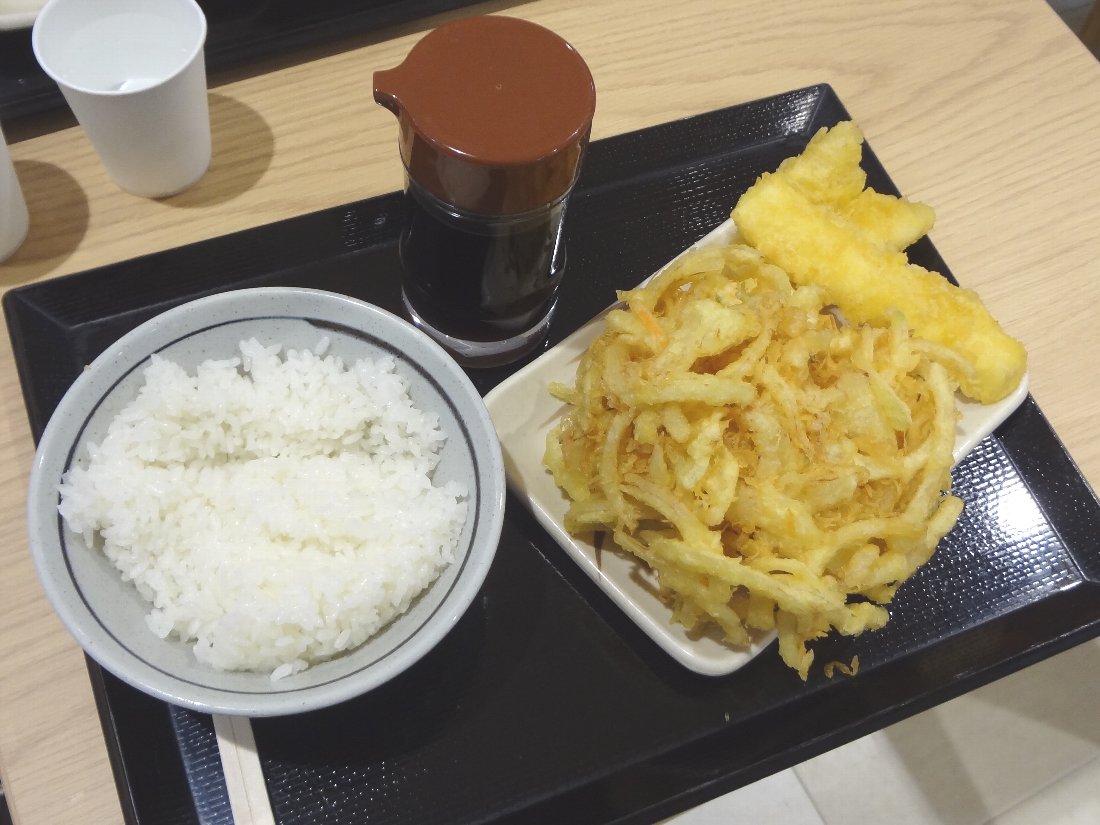 > 1人の時はかき揚げはお持ち帰りで!と会計時に言うと紙袋に入れてくれます。