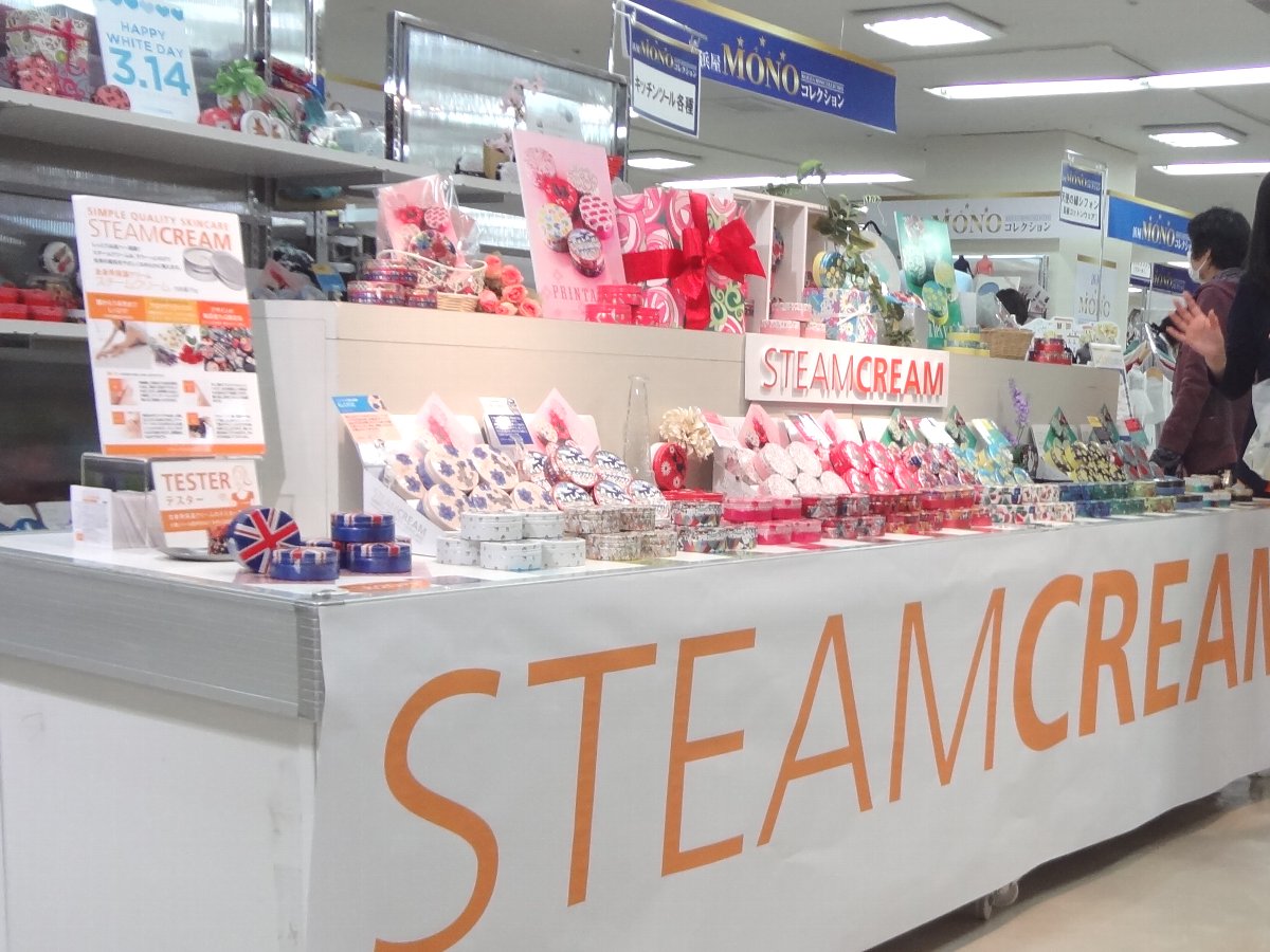 スチームクリームは…もちろん、マルチに使える保湿クリームで、ときどきアミュの1階に出店していたりしました。バリエーションに富んだ容器がかわいいと評判です。