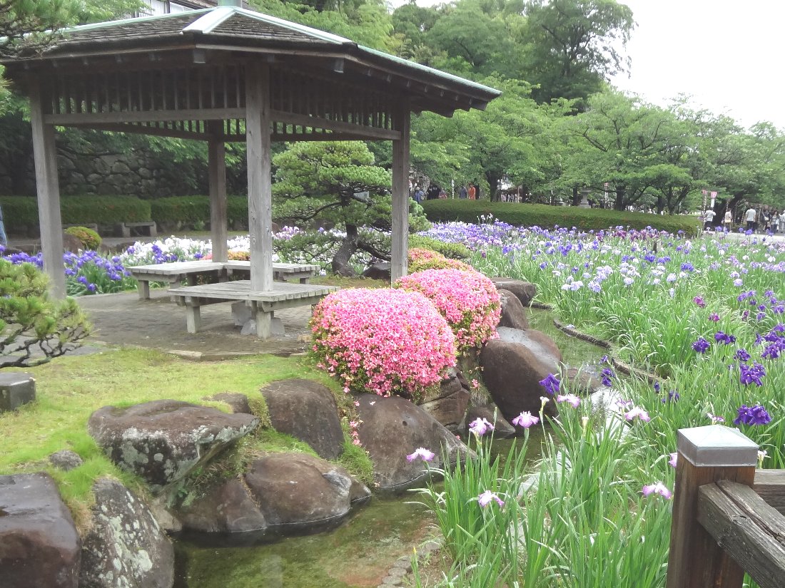 東屋とサツキと花菖蒲です