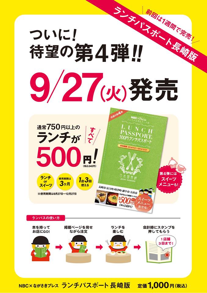 過去3回発行された「長崎ランチパスポート」は毎回楽しませていただきましたが「第4弾」がこの秋発行されるそうですね(^^♪
