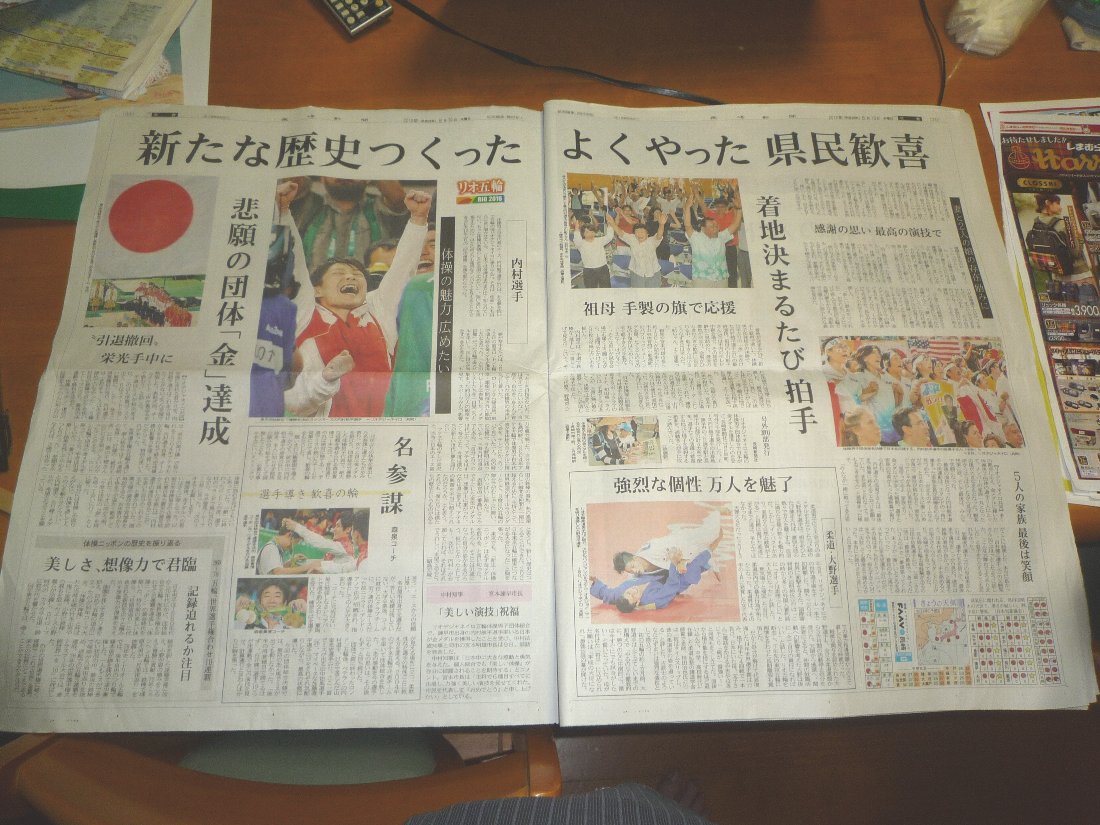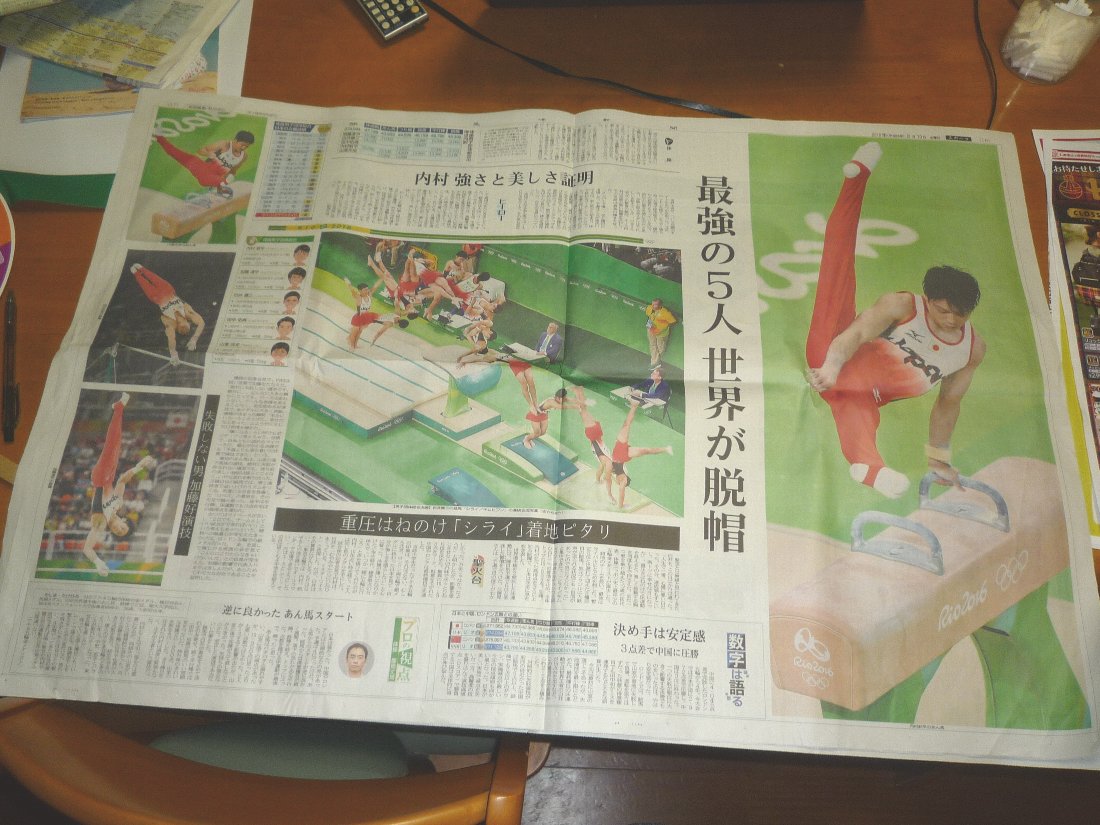 でも普段はテレビ欄である新聞の最終面にはオリンピック体操団体で金メダルを獲得した内村選手の大きな写真が・・・新聞休刊日の前日でもないのにテレビ欄が移動しているのは初めて見ました(^^;