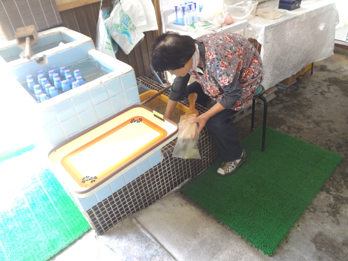 「持ち帰り」で頼んだらおばあちゃんが湧水を貯めた水槽からところてんを取り出し昔ながらの「ところてん突き」でひとつづつ袋に入れてくれます