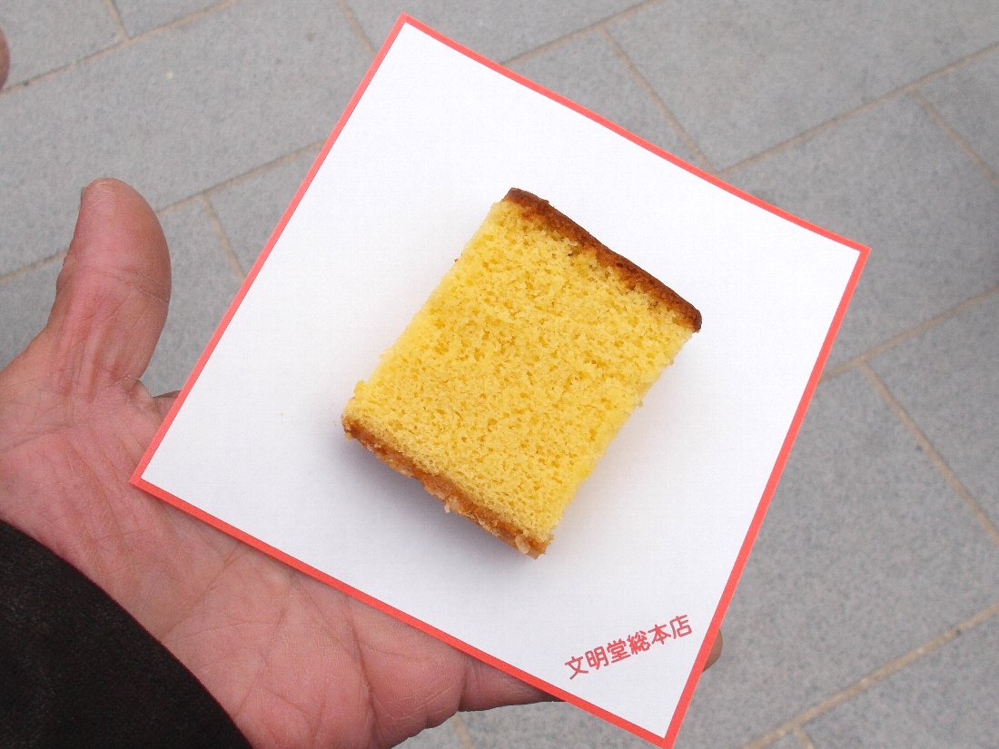 こちらが「振る舞い」の「特製カステラ」ですが底に「ザラメ」が付いていますね・・・無論私は貰っただけで食べるのは女房ですが(^^;