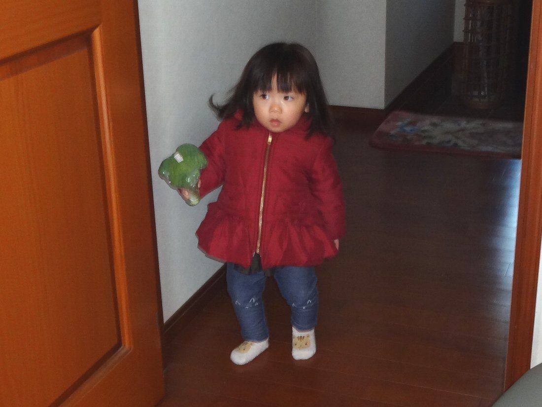 長男家族は昼前位に到着するという話だったのでその前に娘が孫2を連れてやってきましたが何故かブロッコリーを持っていますね・・・聞けば直前に寄ったコンビニで見つけたのを手にして離さなかったそうです(^O^)
