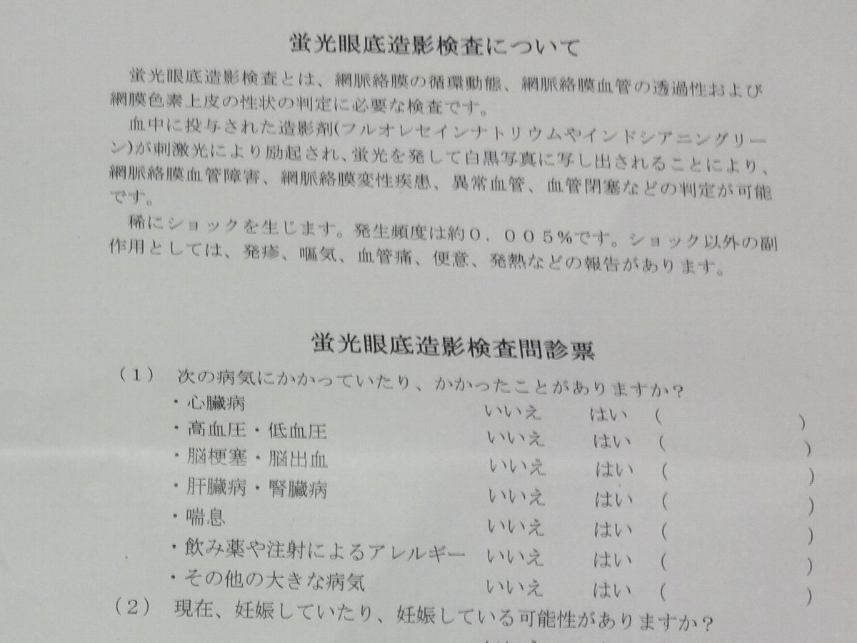 その代り来週には「蛍光眼底造影検査」というのを行うそうですがかなり低い確率とはいえ重大な副作用(アナフィラキシー)が起こる可能性があるそうで詳しい説明があり「同意書」も提出しないといけないそうです