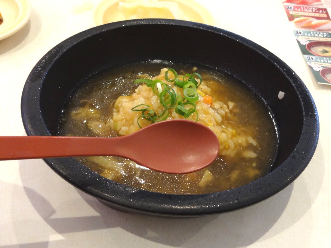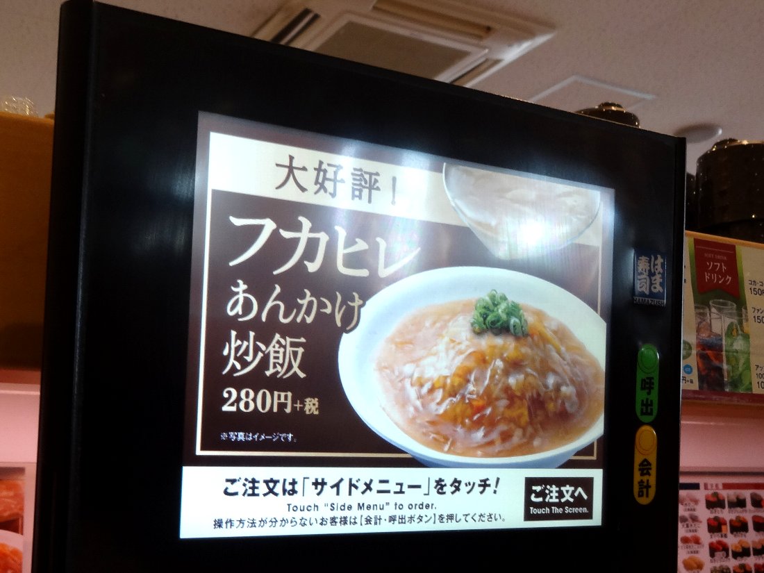 ほどなくしてやってきたのが「フカヒレあんかけ炒飯」280円税別です・・やはり回転すしチェーンのメニューは量はちょっと少なめですが価格が安いので頼みやすいですよね(^^;
