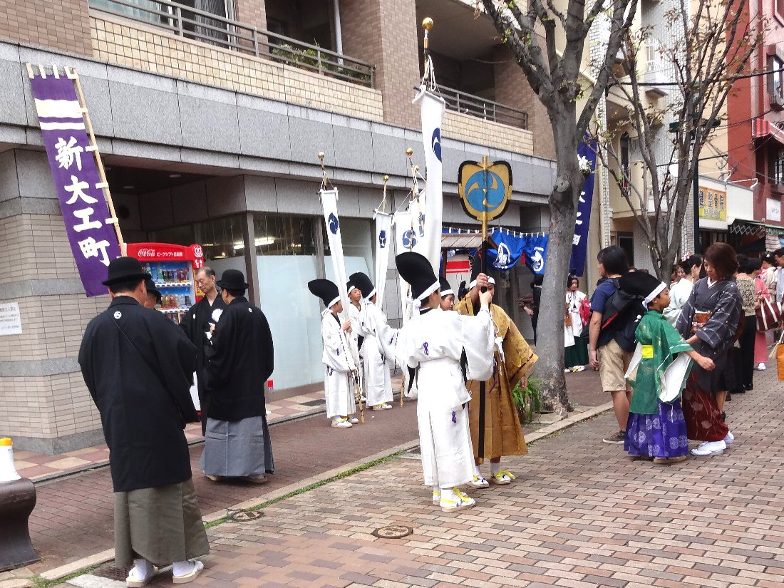 近寄ってみるとくんちの「お下り」に参加する人たちが集合していました・・・ということは今年は「年番町」で3年後に出場するのでしょう