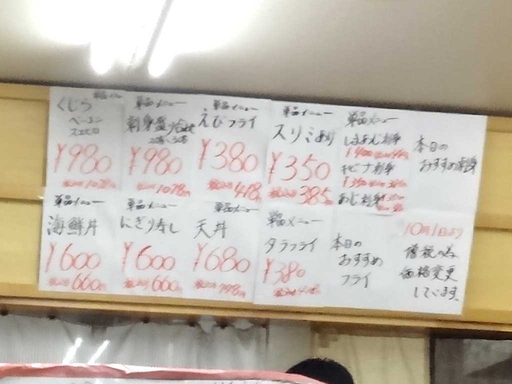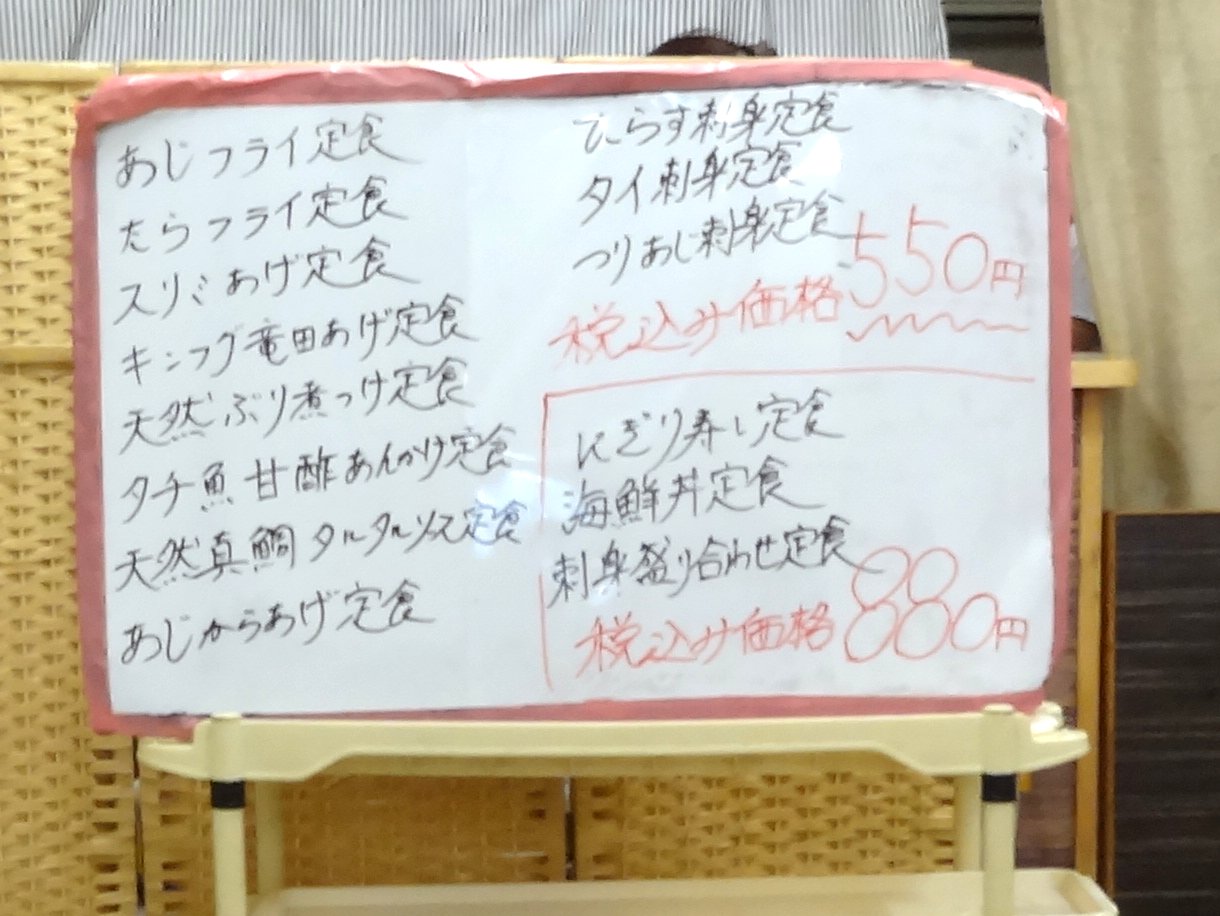 こちらが「定食メニュー」ですが先日まで税込500円だったメニューが550円税込になっていましたし税別780円だった「にぎり」や「海鮮丼」の定食は税込880円になっていましたからやはり若干値上げしているみたいですね(^^;