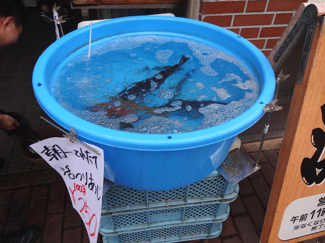 本来は魚屋さんですから看板の横の桶にはこの日の朝に釣ってきた「活きアジ」が泳いでいますし