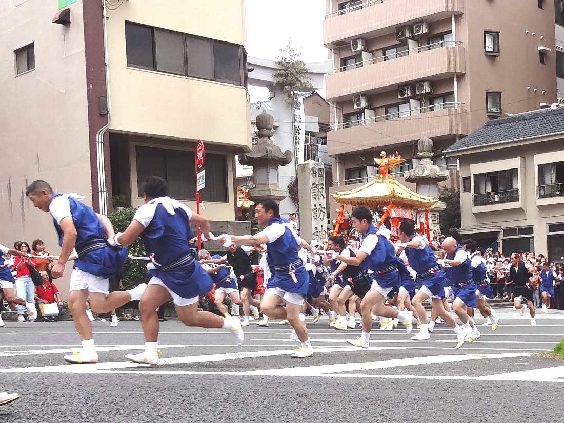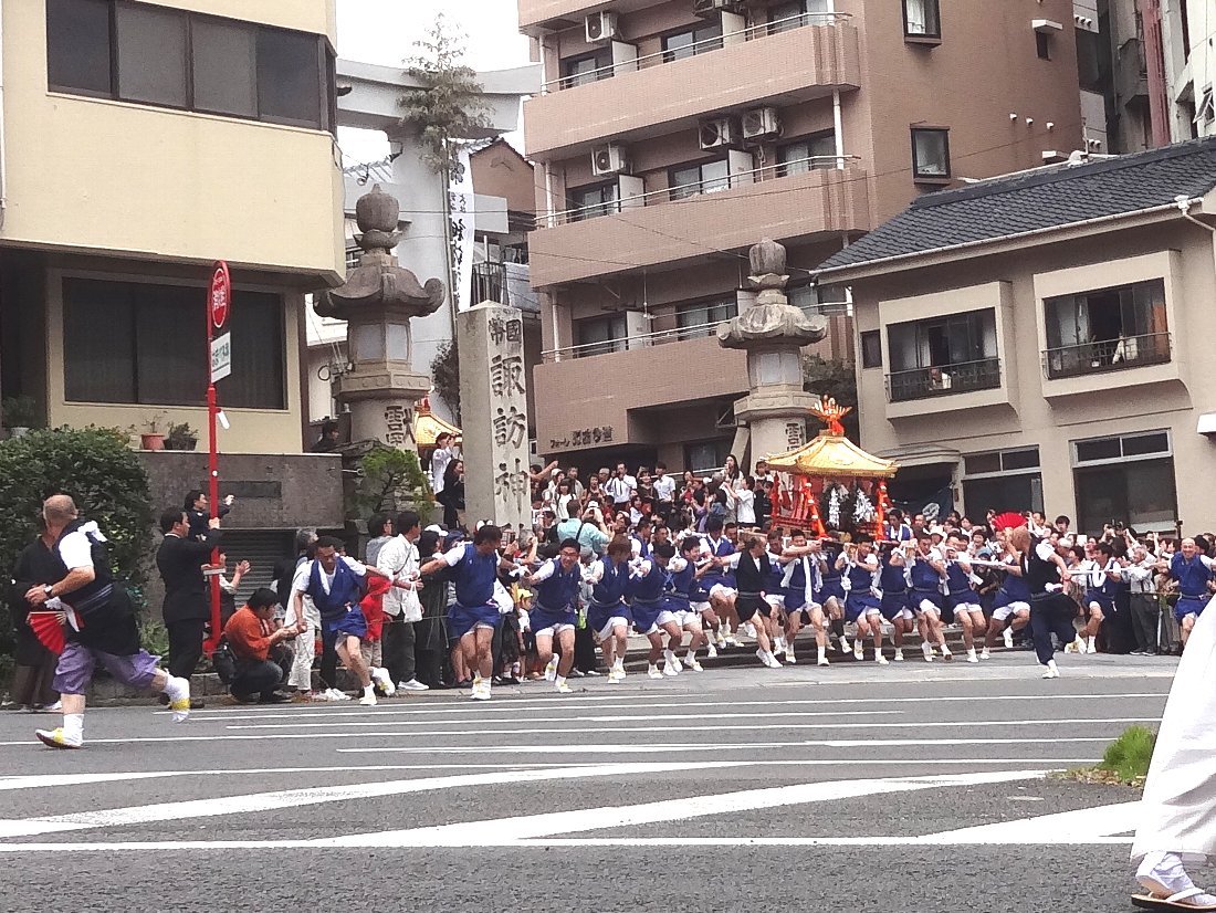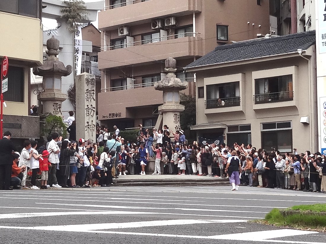 ランチを食べた後に「お下り」でお神輿が諏訪神社の石段を駆け下りてくる「もりこみ」を見ようと道路を挟んだ反対側のいつもの場所に陣取りました