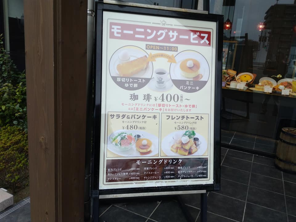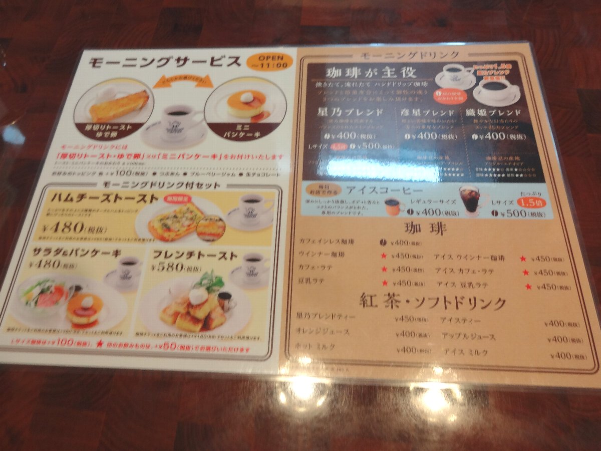 「モーニングセット」を注文した後にメニューを見て気付いたのですが「ハムチーズトースト」というのが480円税別であったのですね・・・これが表に書いていたら頼んでいたのですが(^^;