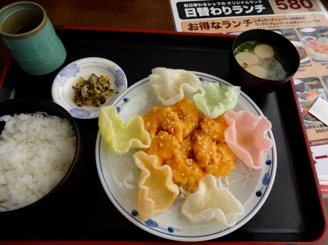 私は今までコースやバイキングでは食べたことがありましたが単品で頼んだことが無いであろう「海老マヨランチ」690円税別にしました・・・画像を見ても判りにくいのですが揚げ物と同じ色のマヨネーズが掛かっているんです(^^;