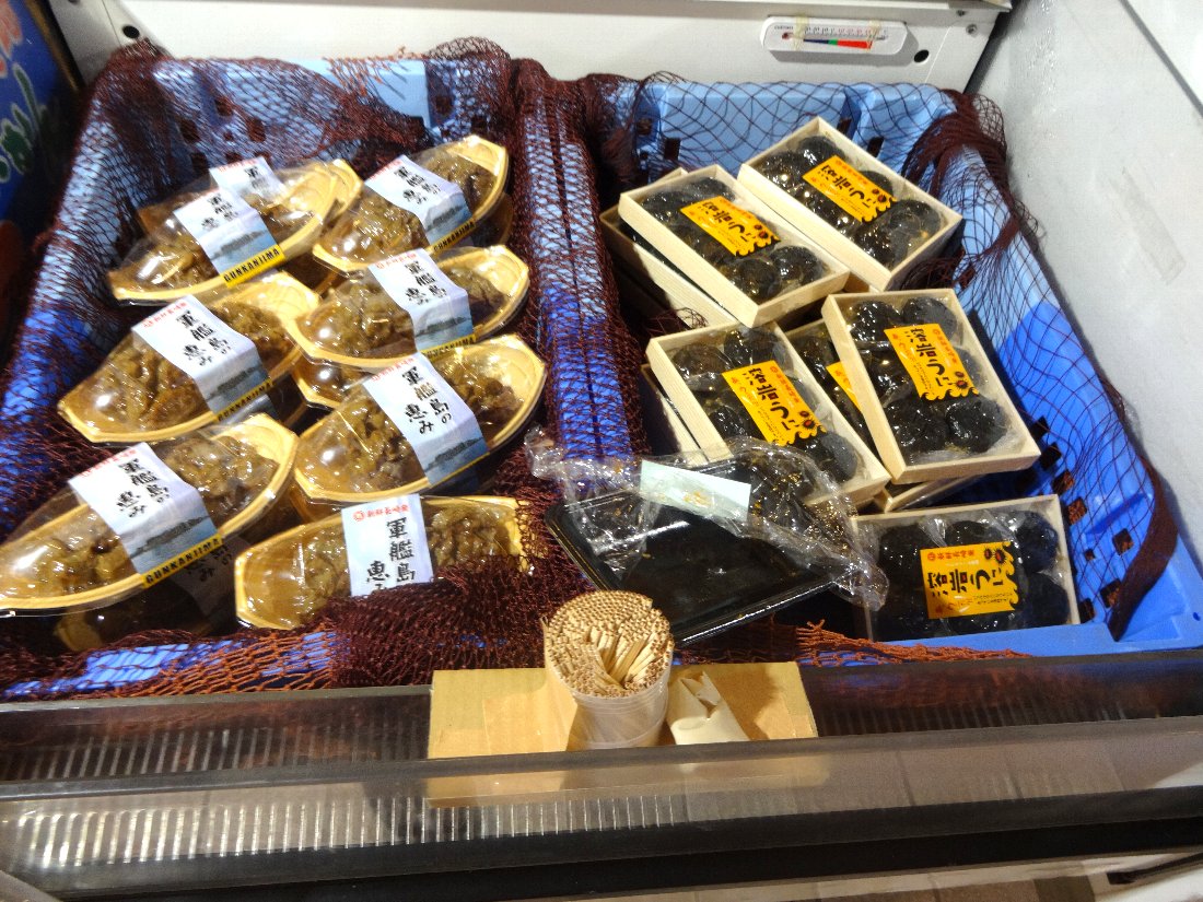店内に入ってまず目に付いたのはいろんな品評会で受賞している「軍艦島の恵み」と今年の新作である「溶岩うに」が並んで陳列されていました・・・当然ここでは試食もふんだんに用意されているので普段はちょっと高くて購入を躊躇う「溶岩うに」をたくさんいただきました(^^;