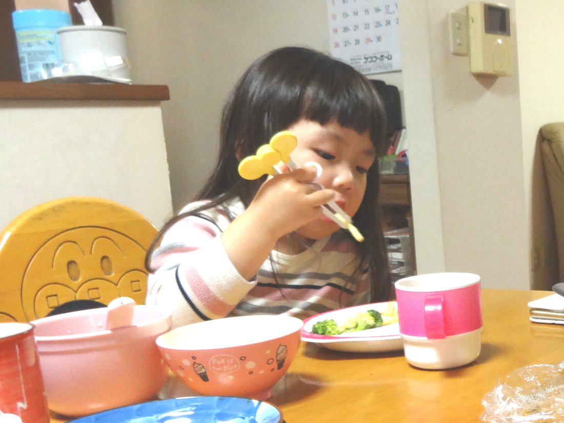 訓練用の箸を上手に使って食べているんですね
