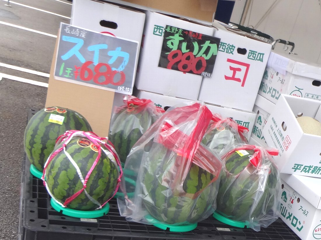 すぐそばでは「長崎産のスイカ」も格安で販売していました・・・「スイカ好き」の女房が買うのかなと思ったら「先日ダイレックスで買ったのがまだ残っている」とのことでした(^^;