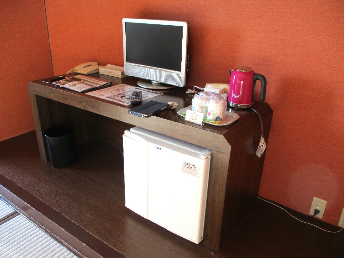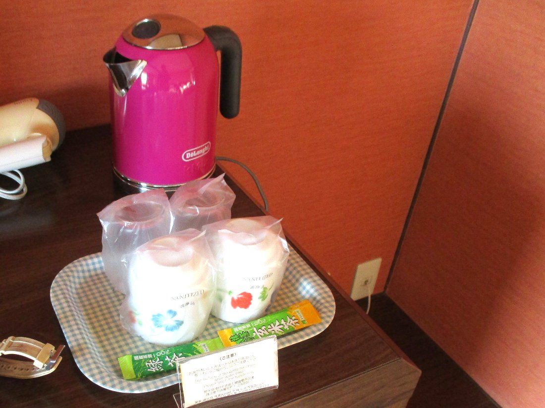 例によって湯沸かしポットと「粉末茶」が用意されていましたがここでも二人で4杯分しか用意されていません・・・普段自宅では4〜5杯お茶を飲む私には当然足りませんね(-_-;)