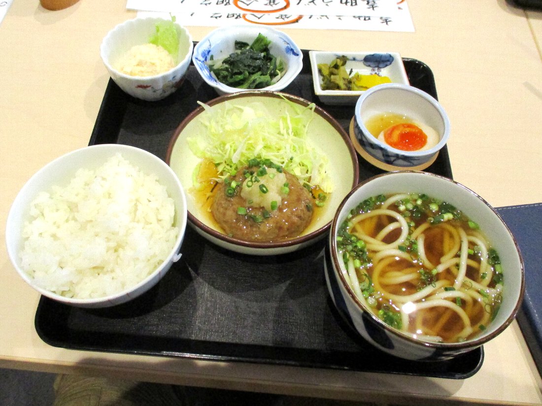 「おろしハンバーグ」に「もやしとほうれん草のナムル」「煮卵」「ポテトサラダ」と「漬物」が付いて800円が「ランチパスポート」で550円で食べることが出来るのです(^O^)