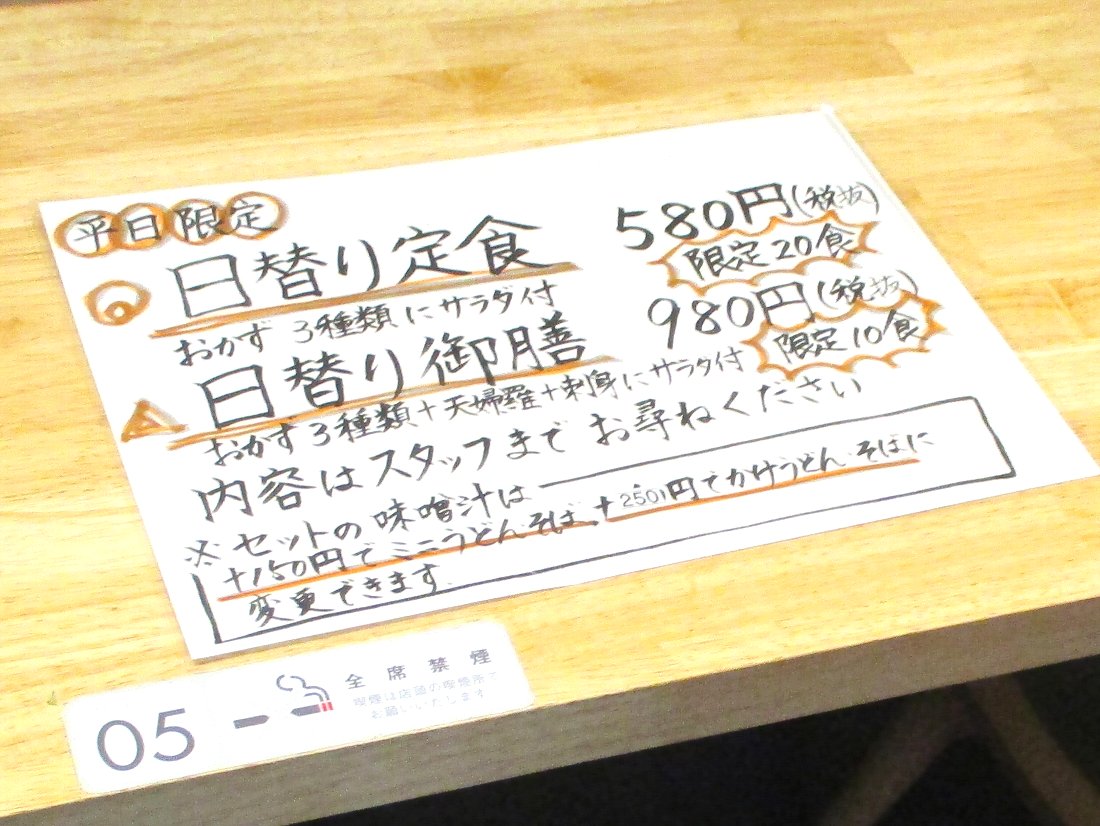 「ランチパスポート」では数量制限は無いのですが「日替り定食」として頼むのには20食限定だそうですね・・・「日替り定食」の「味噌汁をミニうどんに変更すると150円」だそうですから580円+150円=730円になり税込にすると803円になるのかな?