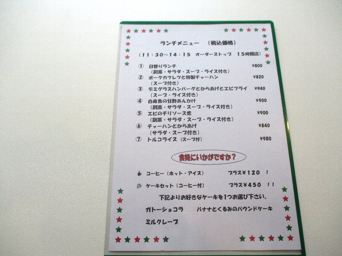 「ランチメニュー」がいろいろありますがどれも1000円以下ですね・・・「トルコライス」980円にしようかなとも思ったのですが「中華」を食べたくって