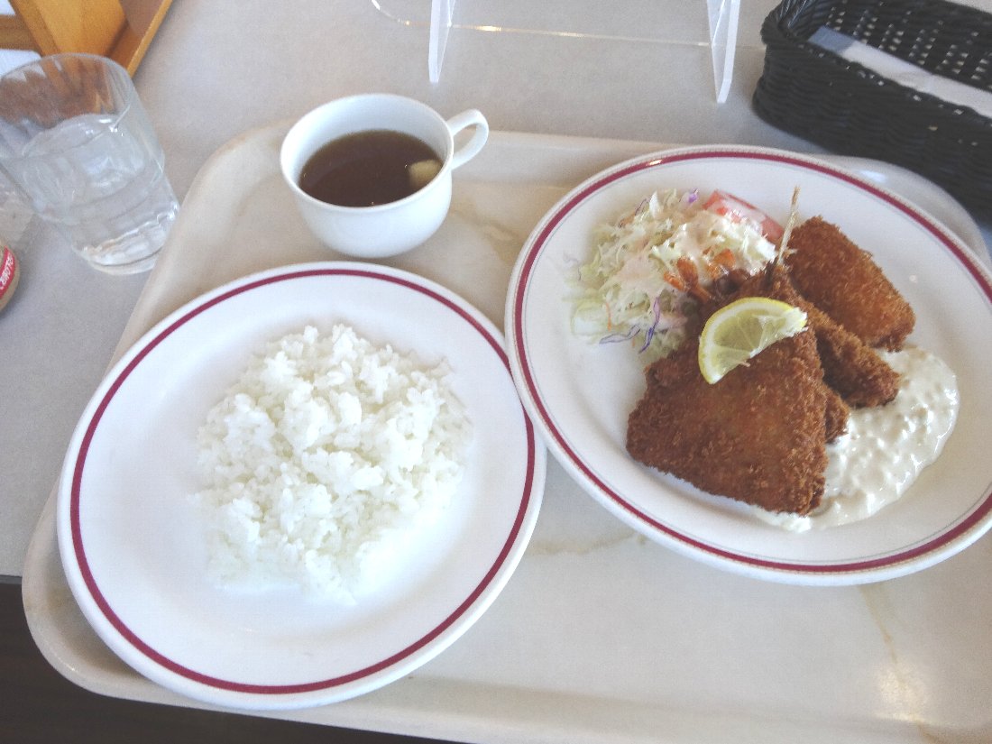 結局適当なものが無かったので「日替りランチ」638円を「ご飯少な目」で注文しましたが33円引きだそうで605円でした・・・「アジフライ」「エビフライ」はまぁまぁだったのですが「イカフライ」はちょっと食べにくかったですね