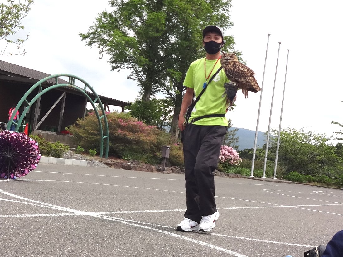「変面」が終了すると今度は「勝龍さん」と同じ「太良町」在住の「りっくん」こと「大江陵太さん」の「鷹パフォーマンス」が始まりましたが最初は「ミミズク」を使ったトークからです