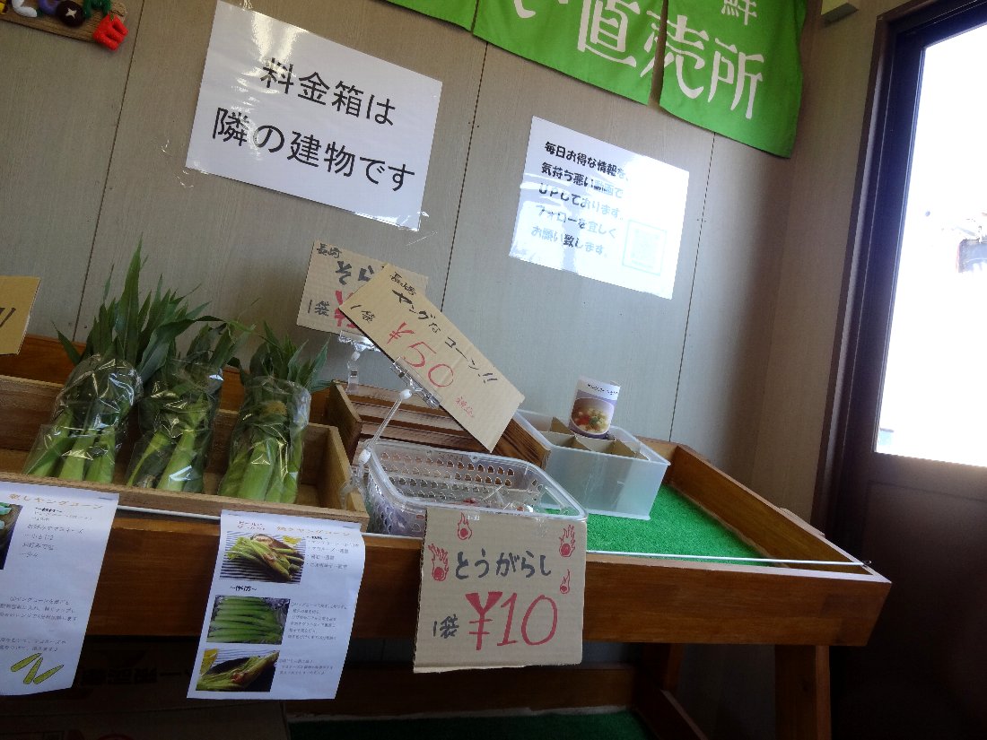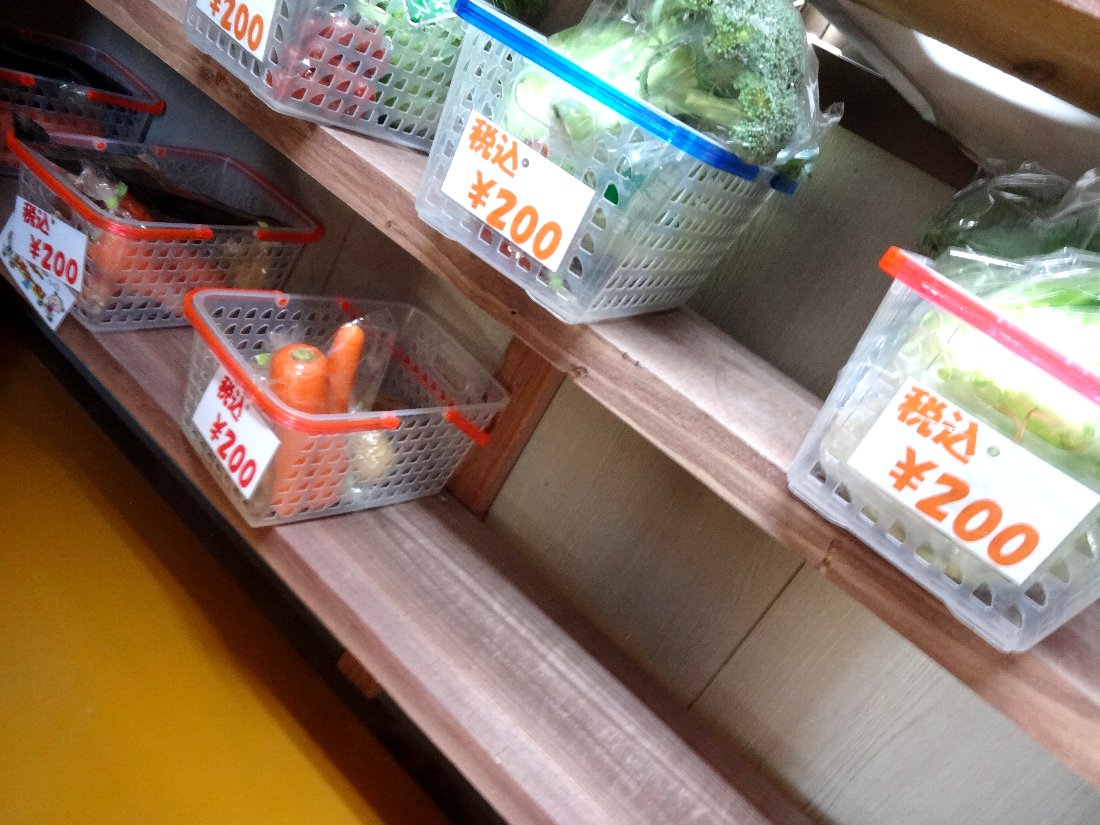 1カゴ200円の野菜など「お買い得品」が並んでいます・・・代金は「料金箱」に自分で入れるシステムですから「お釣り」は出ないので注意が必要ですね