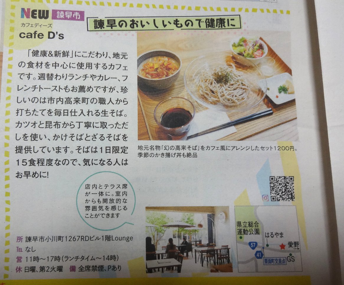 先月でしたか諫早で「高来そば」の幟を見かけたのですがネットで調べてもお店が判りませんでした・・・でも今週の長崎新聞「とっとって」を見ると「カフェ ディーズ」というのがニューオープンしたとの紹介がありました(^^)