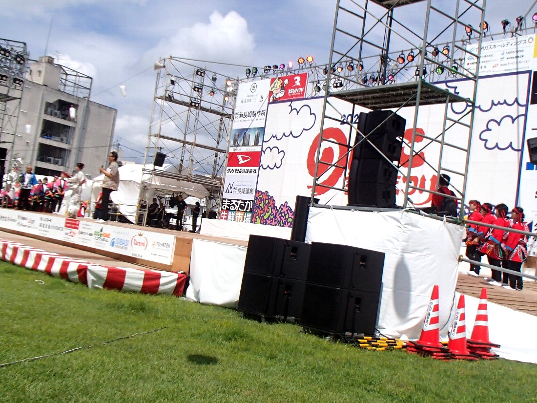 アーケードからメイン会場の市役所前広場に行くと「市内各地民踊の祭典」の出演者が集まり始めていましたが