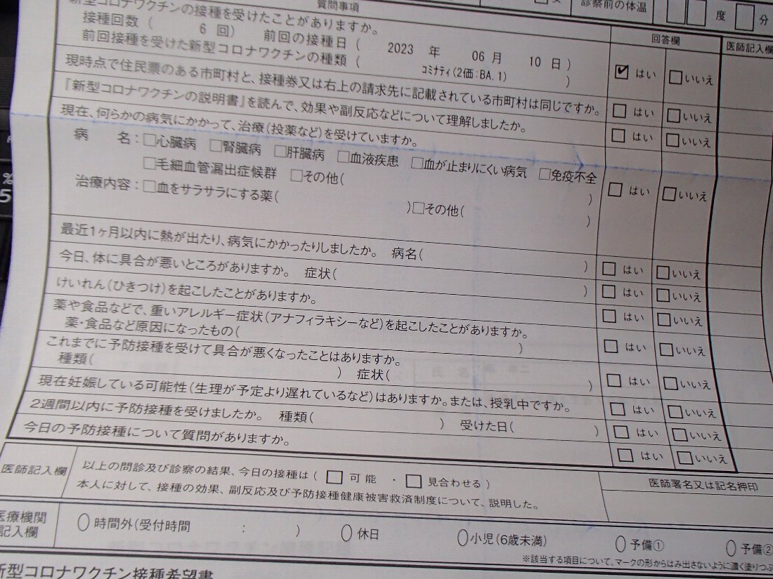 いつも接種会場で思い出し書いている「問診票」も書いときましょうか(^^;