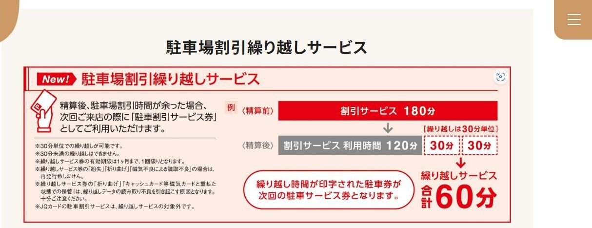 後から知ったのですが「2時間サービス」の駐車券の使わなかった分は次回に持ち越せるそうですね・・・この日は1時間分しか使わなかったので残りは1か月以内は使えるそうです