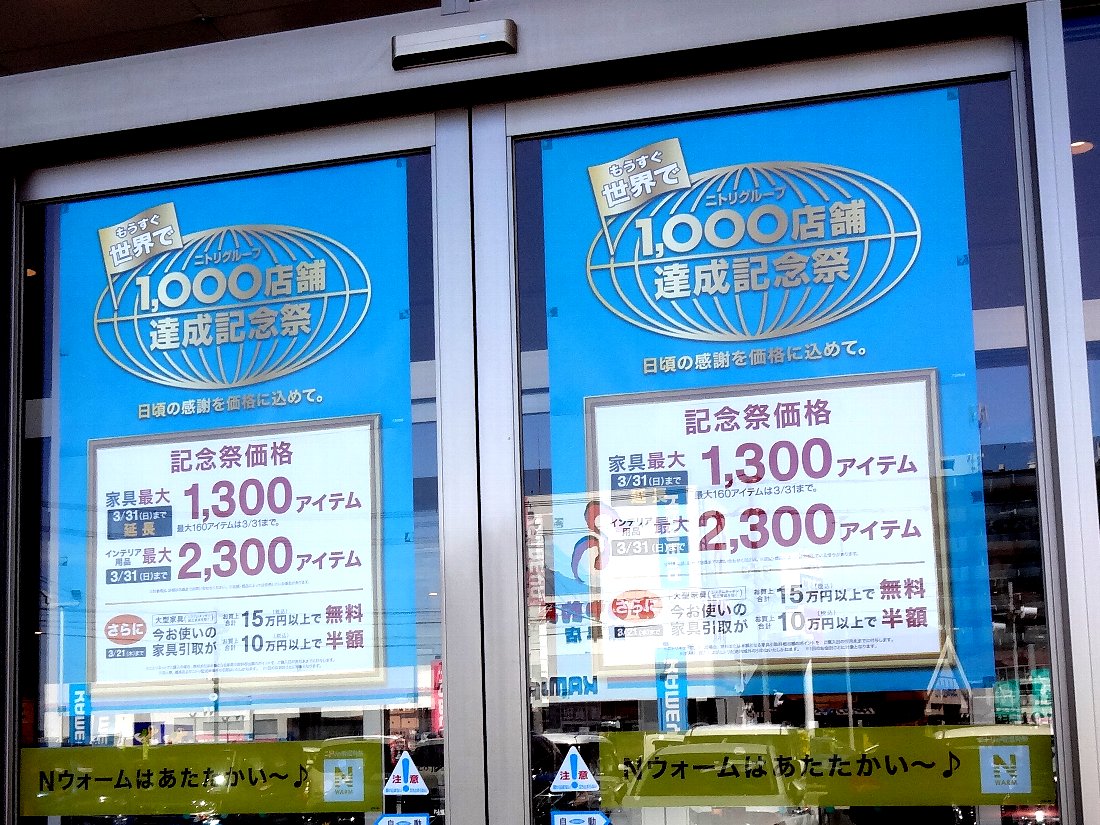 「ニトリ」は「世界で1000店舗達成」するそうです・・・10数年前に長崎店がオープンした時にはまだ全国で150店舗くらいだったのにね(^^;