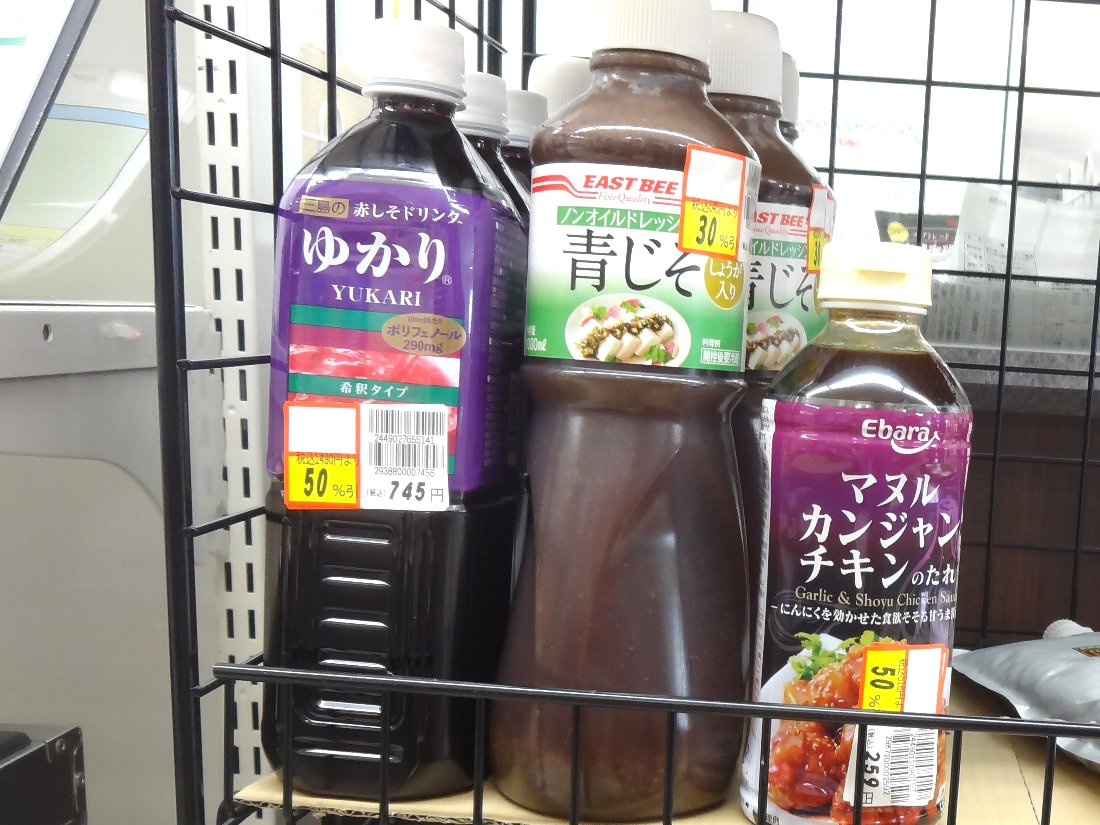 処分コーナーにあった「赤しそドリンク」ですが「ゆかり」というネーミングではあまり売れないのじゃないでしょうか?