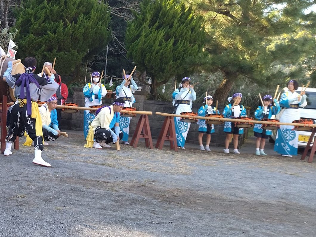 ここが「土井首神社」の拝殿ですが「竿浦・江川浮立」のメンバーがお参りしていますね