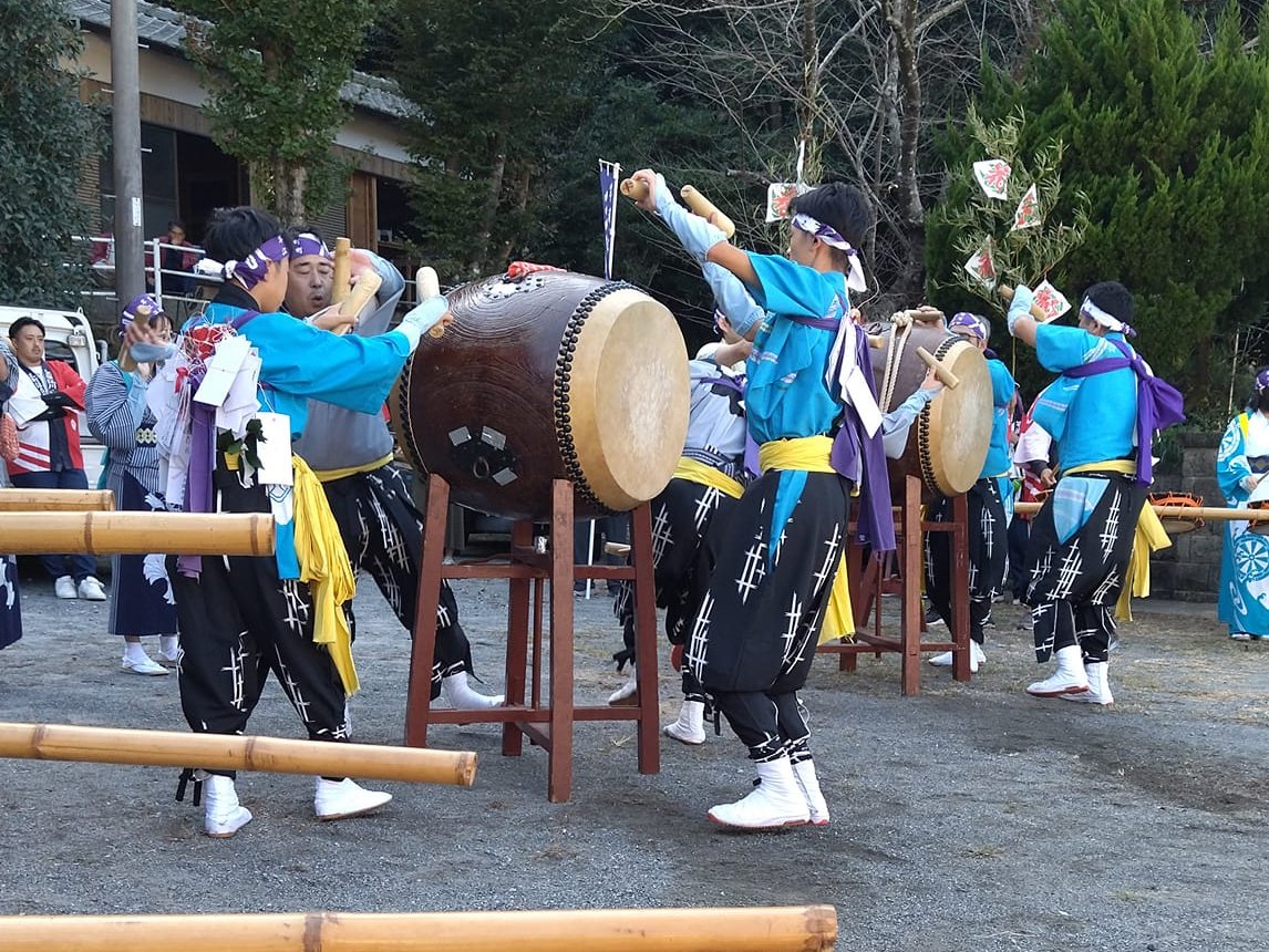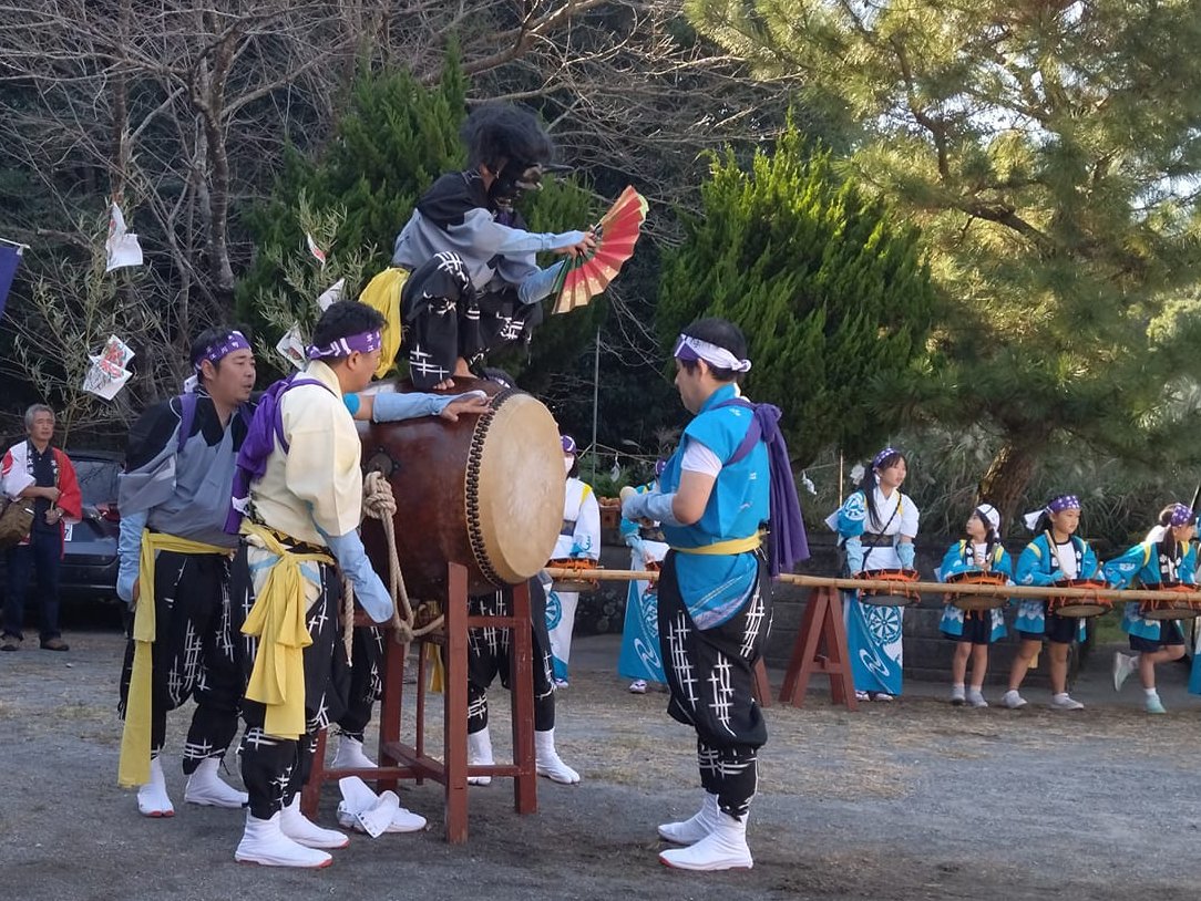 鬼の面を付けた若者が太鼓の上で舞うのです