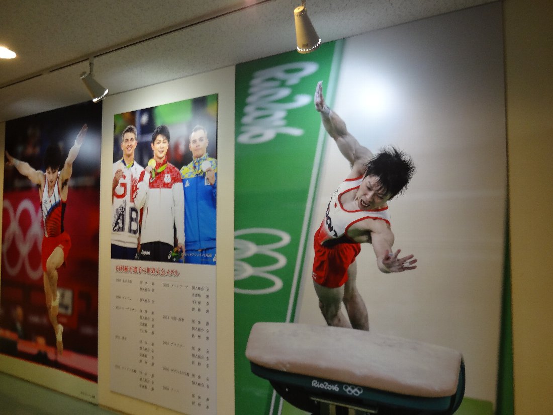 「内村記念アリーナ」という名前が付いているくらいですから「内村航平選手展示コーナー」というのがあるのです(^^)