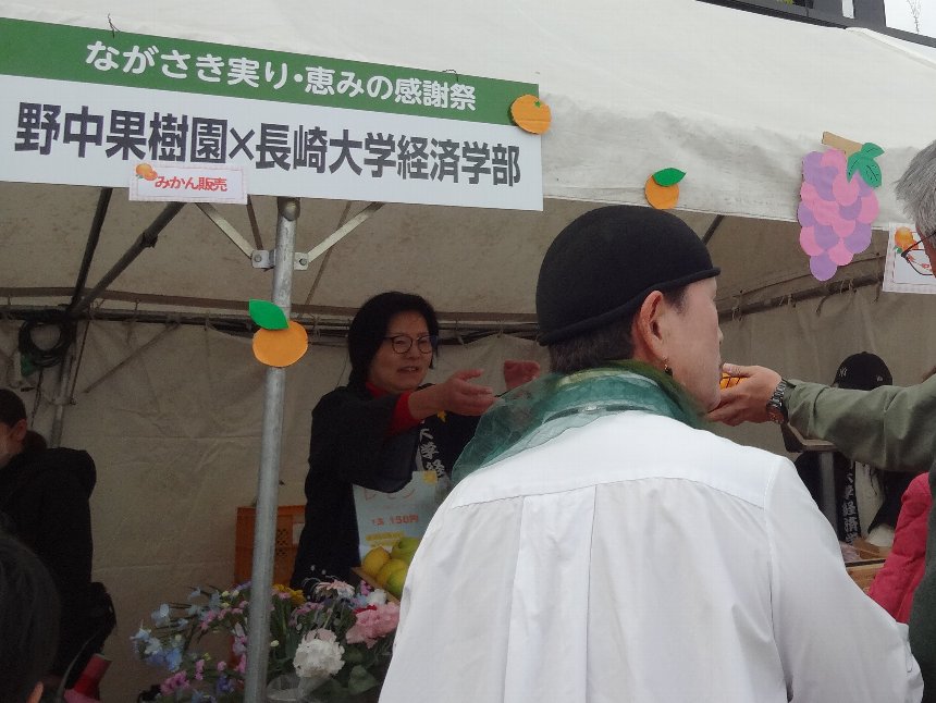 「野中果樹園」と「長崎大学経済学部」がコラボしたブースですが「みかんの量り売り」をしている意味が判りません(^^;
