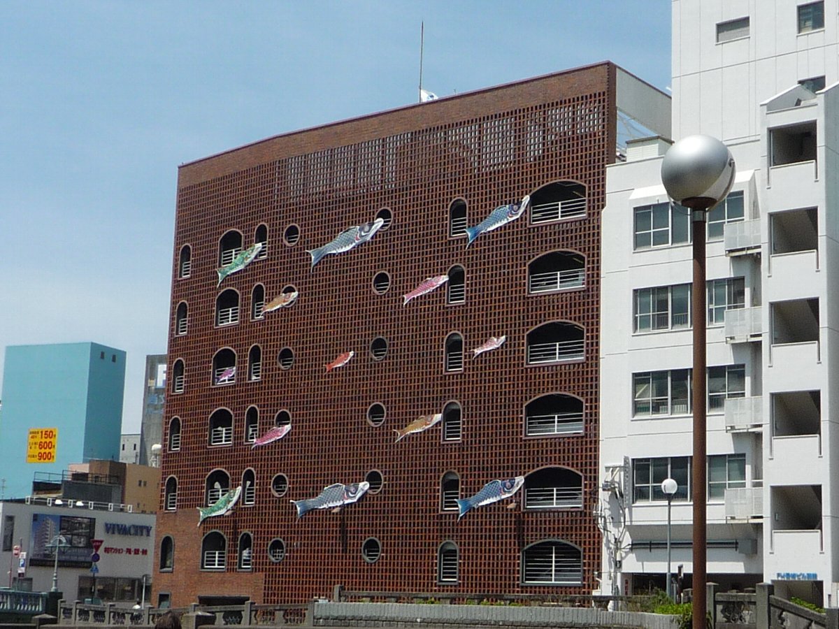 賑橋のパーキングビルに鯉のぼりが泳いでいました(^^)