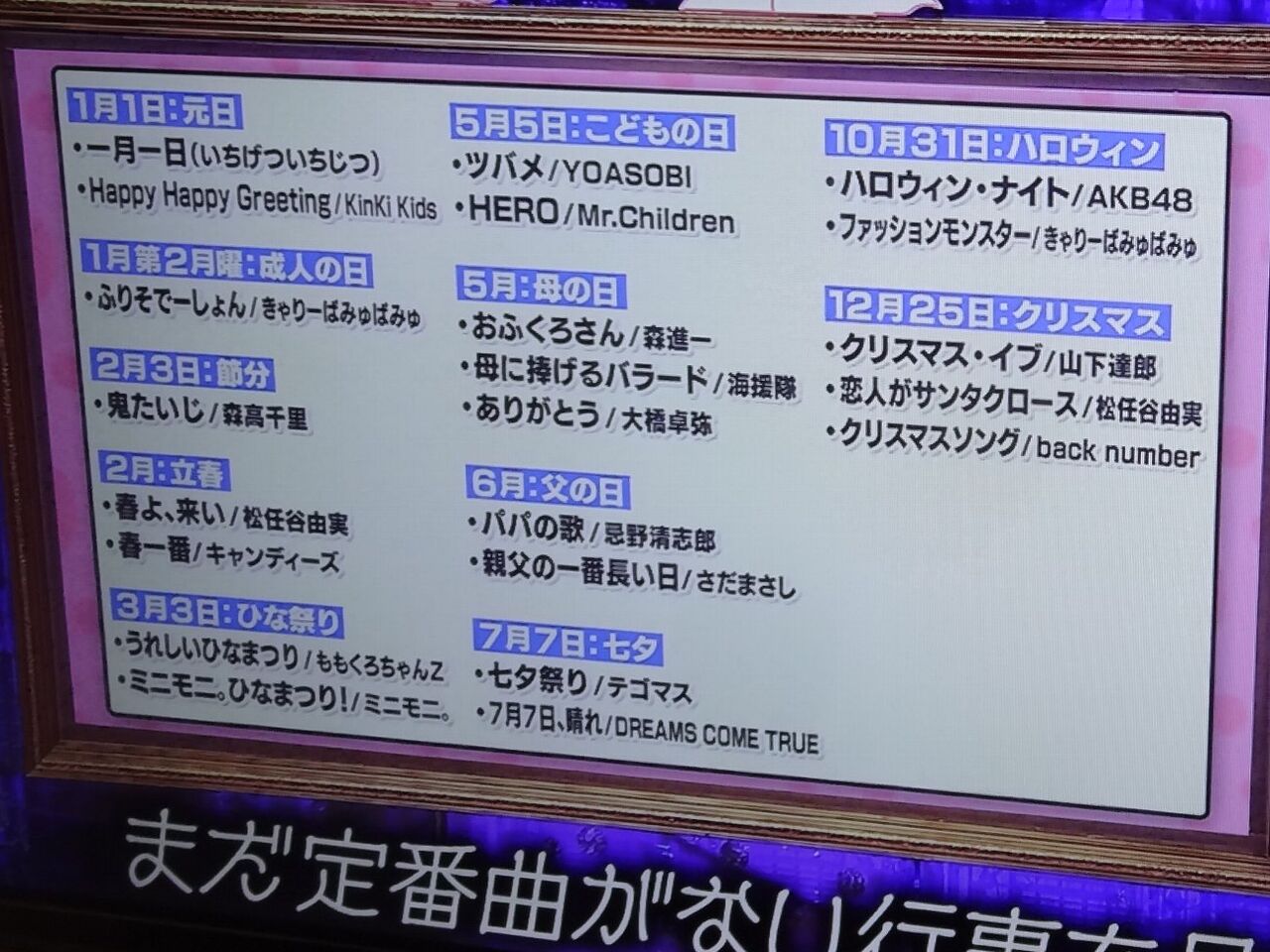 お正月前は「もういくつ寝るとお正月〜♪」という「お正月」ですし、雛祭り前には「明かりを付けましょ雪洞に」の「雛祭り」で、子供の日には「柱の傷はおととしの」がどこのお店でも流れています