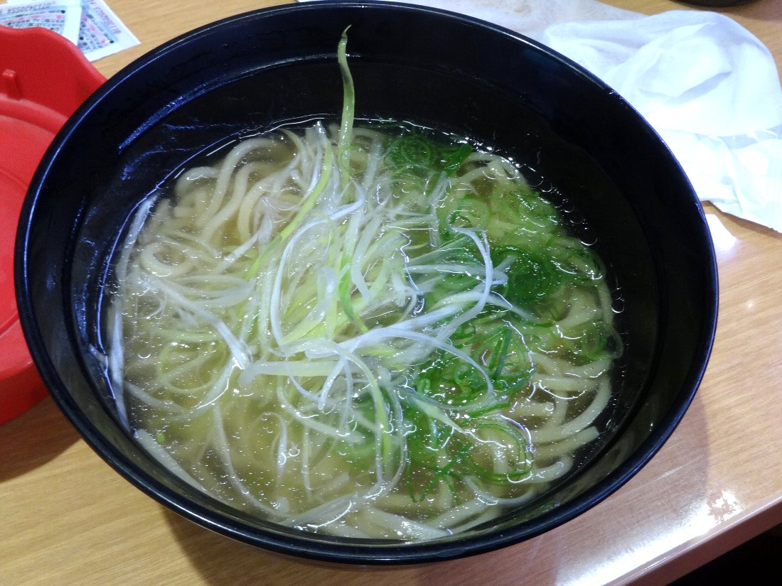 こちらが「かけラーメン(ふぐ塩)」220円です・・・麺はいつもの中太麺ですしトッピングも「長ネギ」の「白みと青み」のみのすごくシンプルな1杯ですが思ったより美味しく戴けました