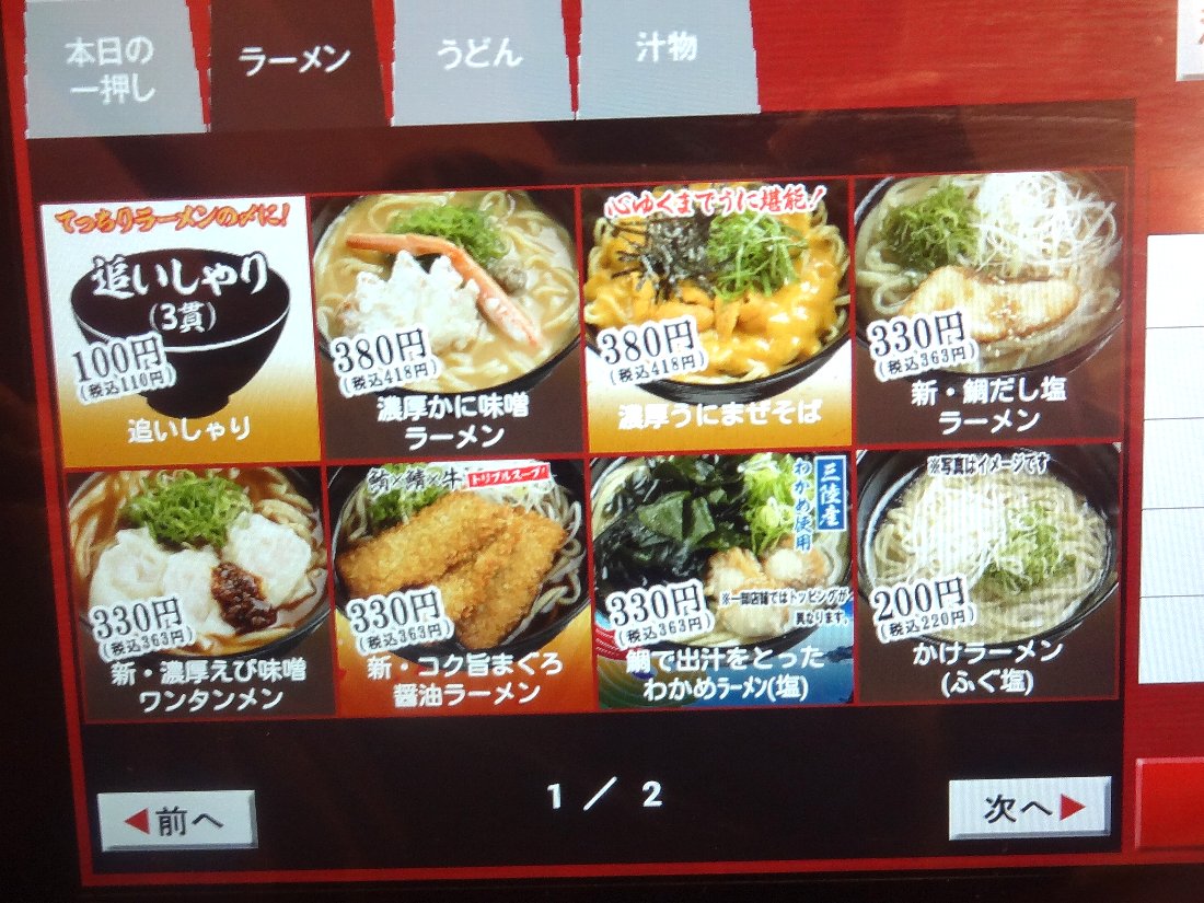 タッチパネルで「ラーメンメニュー」を見ると「濃厚!うにまぜそば」がまだ残っていたので頼もうと思いましたが・・・右下にある「かけラーメン(ふぐ塩)」というのは初めて目にしましたが以前からあったのでしょうか?