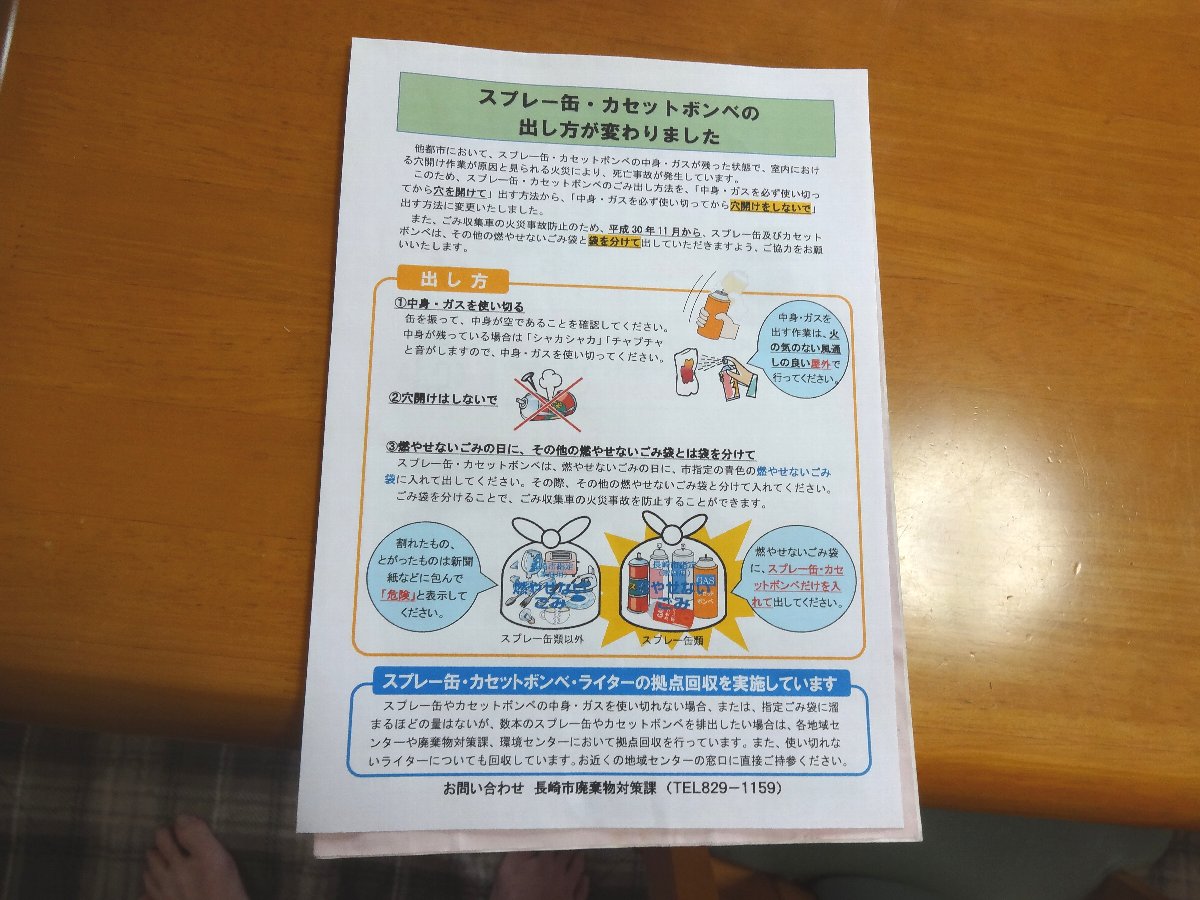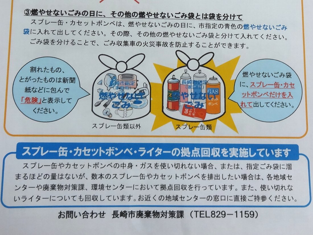 他の「燃えないゴミ」と袋は分けるそうですが長崎市では「中身を使い切れない」場合には各支所(地域センター」に持参してもいいそうです・・・実際お年寄り世帯はそうしてもらわないと大変でしょうね
