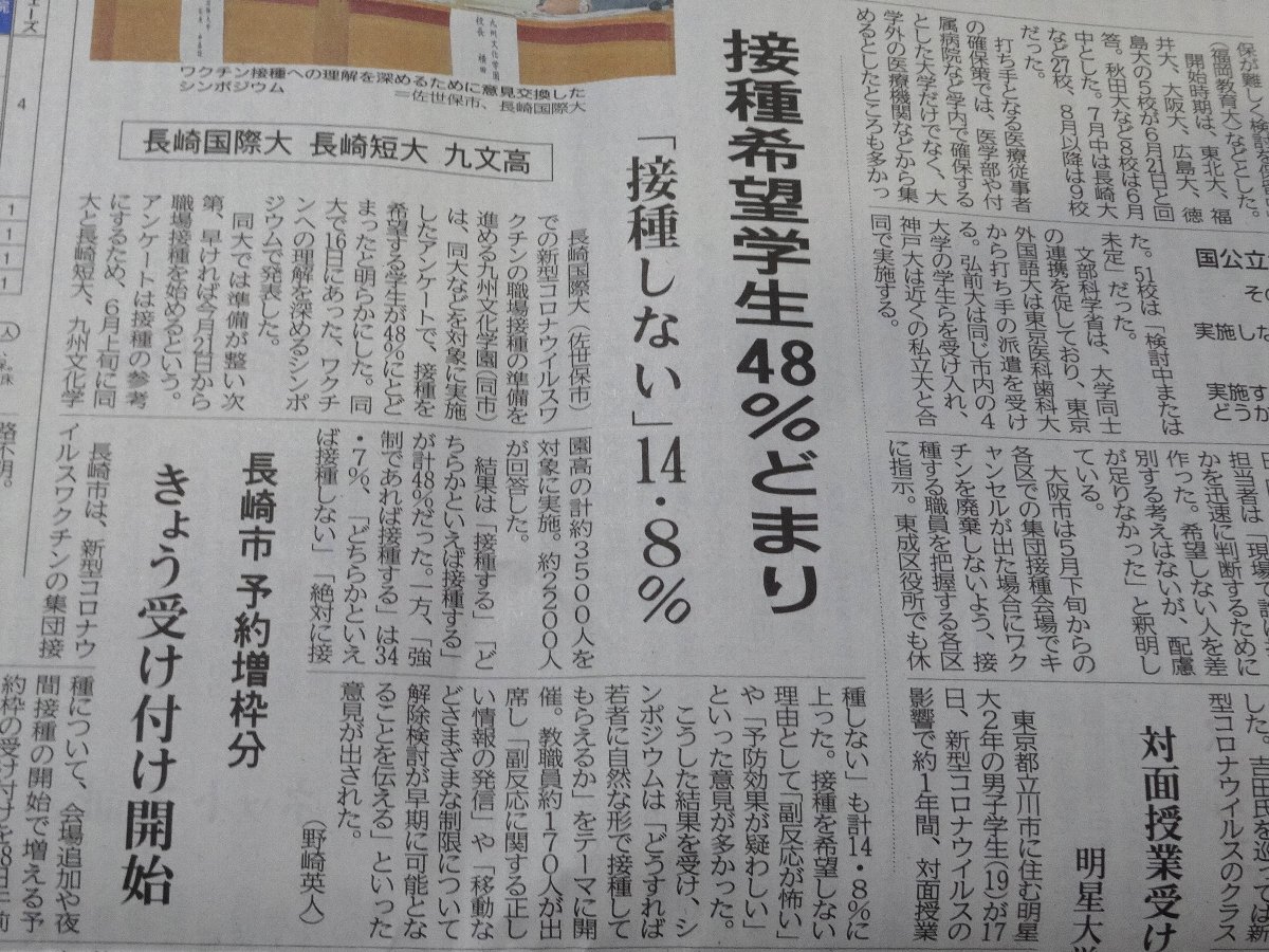何でも「職場接種」として佐世保にある「長崎国際大学」でも「先行接種」を行うそうですがそれに先立って学生にアンケートを取ったところなんと希望者は48%しかいなかったそうです・・・特に「接種しない」が15%近くいたのには驚きです