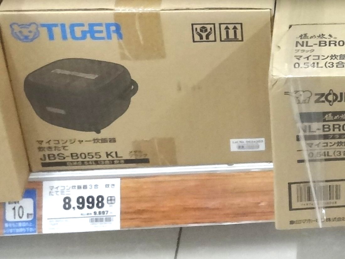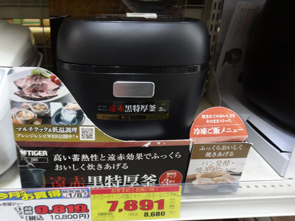 「3合炊き」の「タイガーJBS-B055」が8680円税込ですから1割引きで7800円くらいになるのです