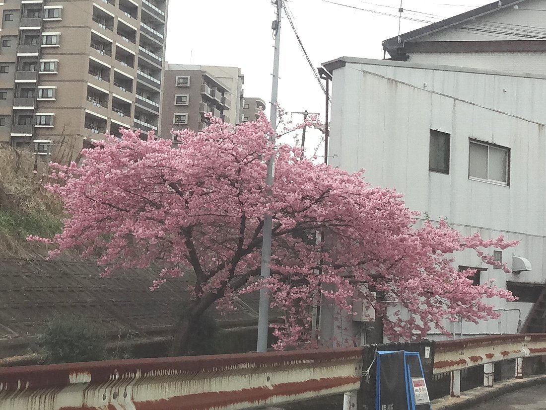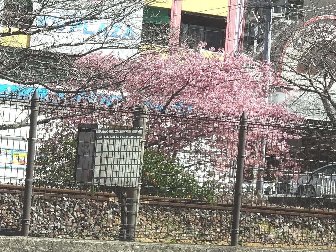 赤迫の「JR線路沿いの桜」の中に2本だけある「早咲き桜」が開花していましたがこれも「河津桜」なんでしょうか?