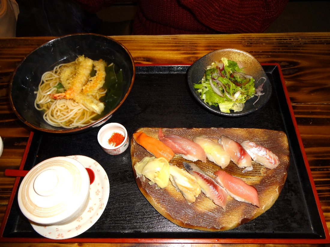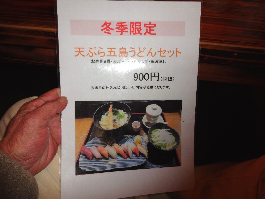 こちらがその「天ぷら五島うどんセット」ですが寿司8貫と天ぷらうどんに茶わん蒸し+サラダが付いているのですからかなりお得ですね・・・女房も「思った以上に五島うどんが美味しかった」と喜んでいました(^^)