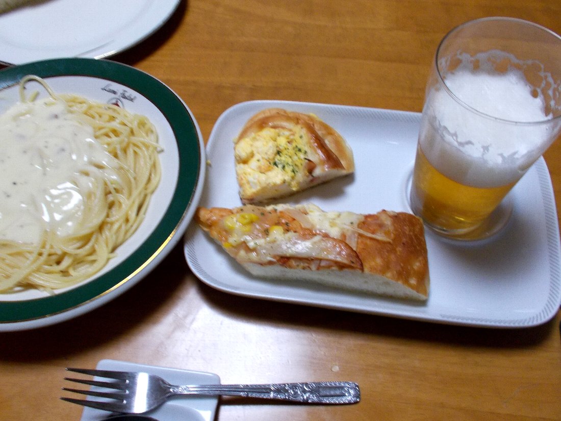 残りのパンはこの日の夕食で「カルボナーラ」と共に頂きました・・・器はずっと以前に貰ったのにほとんど使ったことが無い「フランフラン」のランチプレートですが付属のマグカップの代わりにビールが載っています(^^;