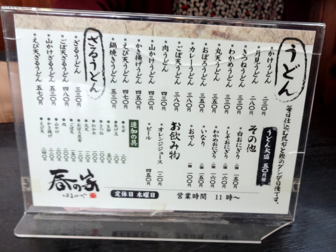 メニューは消費税が上がったにもかかわらず相変わらずの低料金・・・もっとも昨年の春ごろに少し値上げして「かけうどん」が200円から230円になっているのですが(^^;