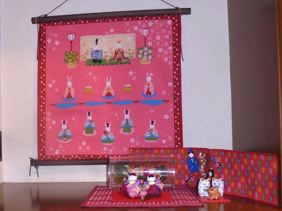 玄関にも「雛飾り」のタペストリーや小物を飾っていますね(^^;