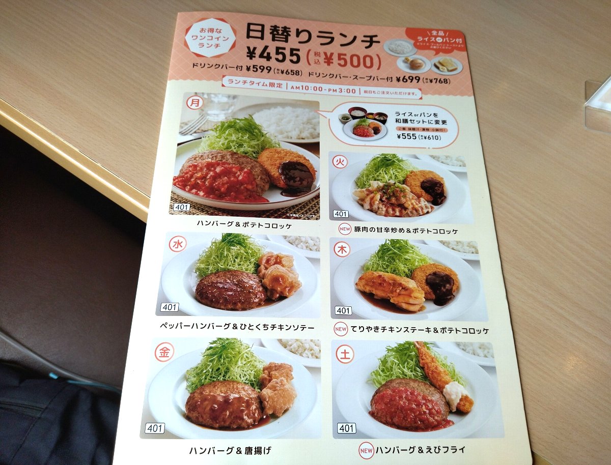 前回訪れた時と比べると「日替わりメニュー」が変わっていますが料金は税込500円ですから一緒です