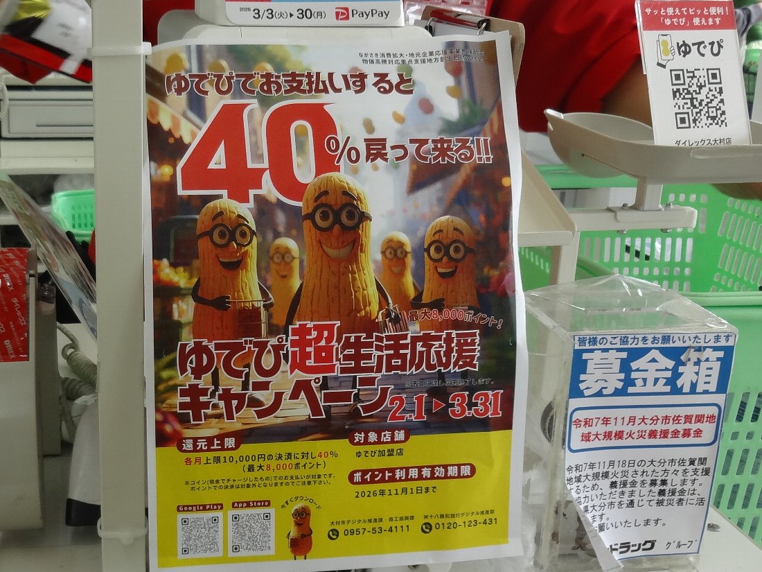 昨日は大村の地域デジタル通貨「ゆでぴ」を使って買い物をしようと思い大村に行ってきました・・・なんと40%還元という他の地区とは比べ物にならないくらいお得なサービスなんですが3/10で終了という噂もありますし(^^;